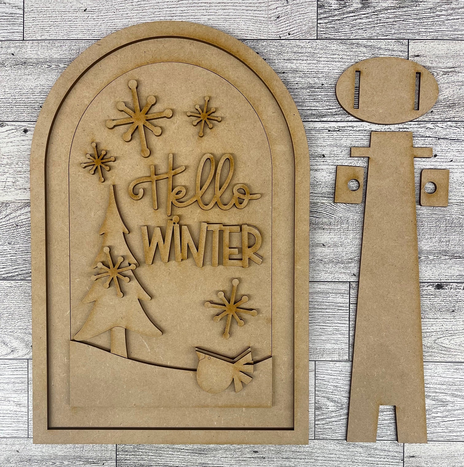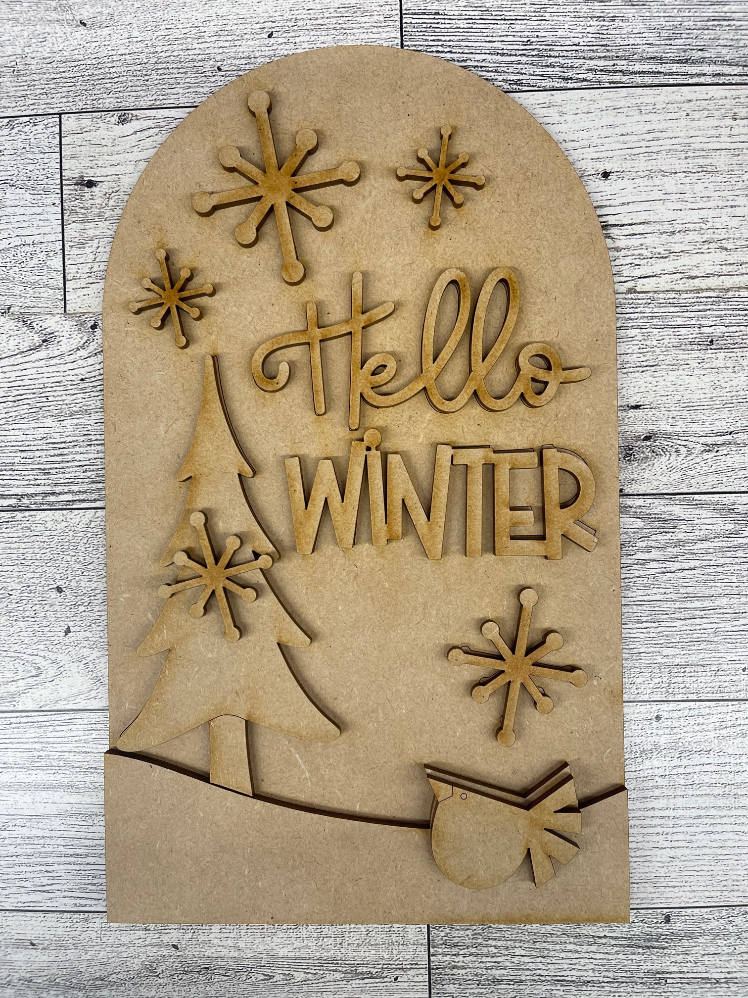 Hello Winter Tree & Bird Arch Insert cutouts unpainted wooden cutouts, ready for you to paint